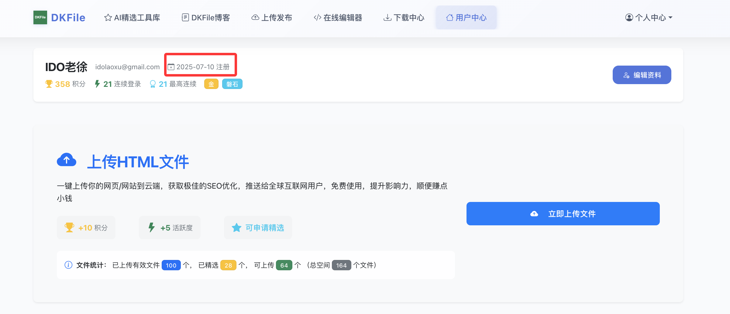 知道自己的「注册时间」,把 注册时间 展示出来了,DKFile 始于 2025.07.09 ,老徐 0710 注册了账号
